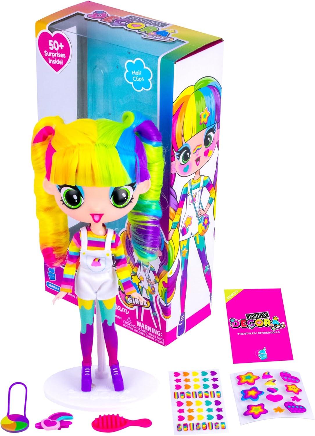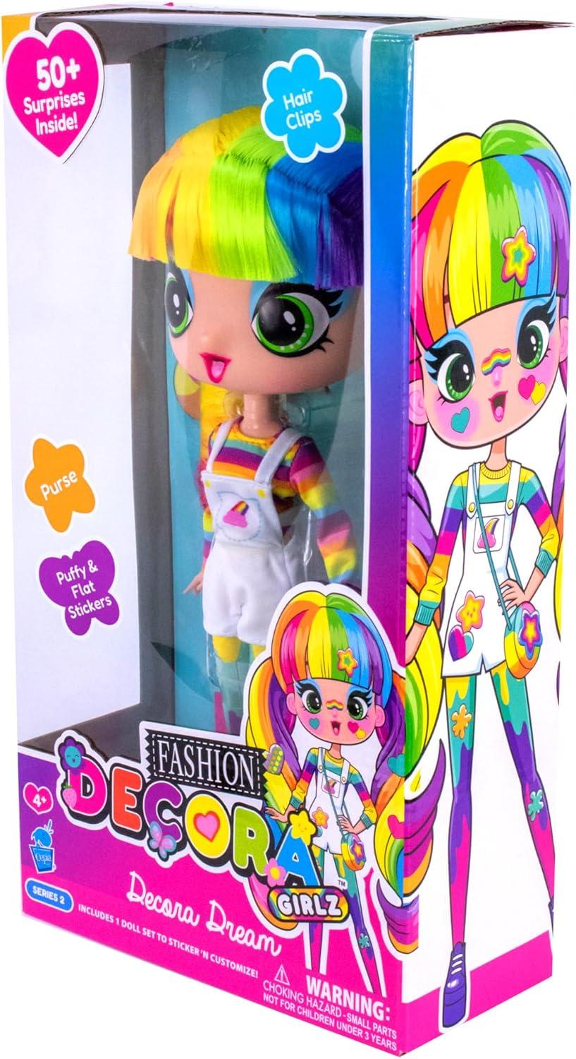 Decora Fashion Girlz 11” Dolls have eye-popping colors and incredible style. Completely poseable and customizable, they come with clothes, accessories, and wear-and-share stickers that make each doll totally unique and a bold celebration of creativity. Adorable Sticker Sheets, Fabric Outfit, Trendy Shoes, Cute Accessories, Wear & Share Hair Clips, Collectible Charm Signature Comb, Doll stand included