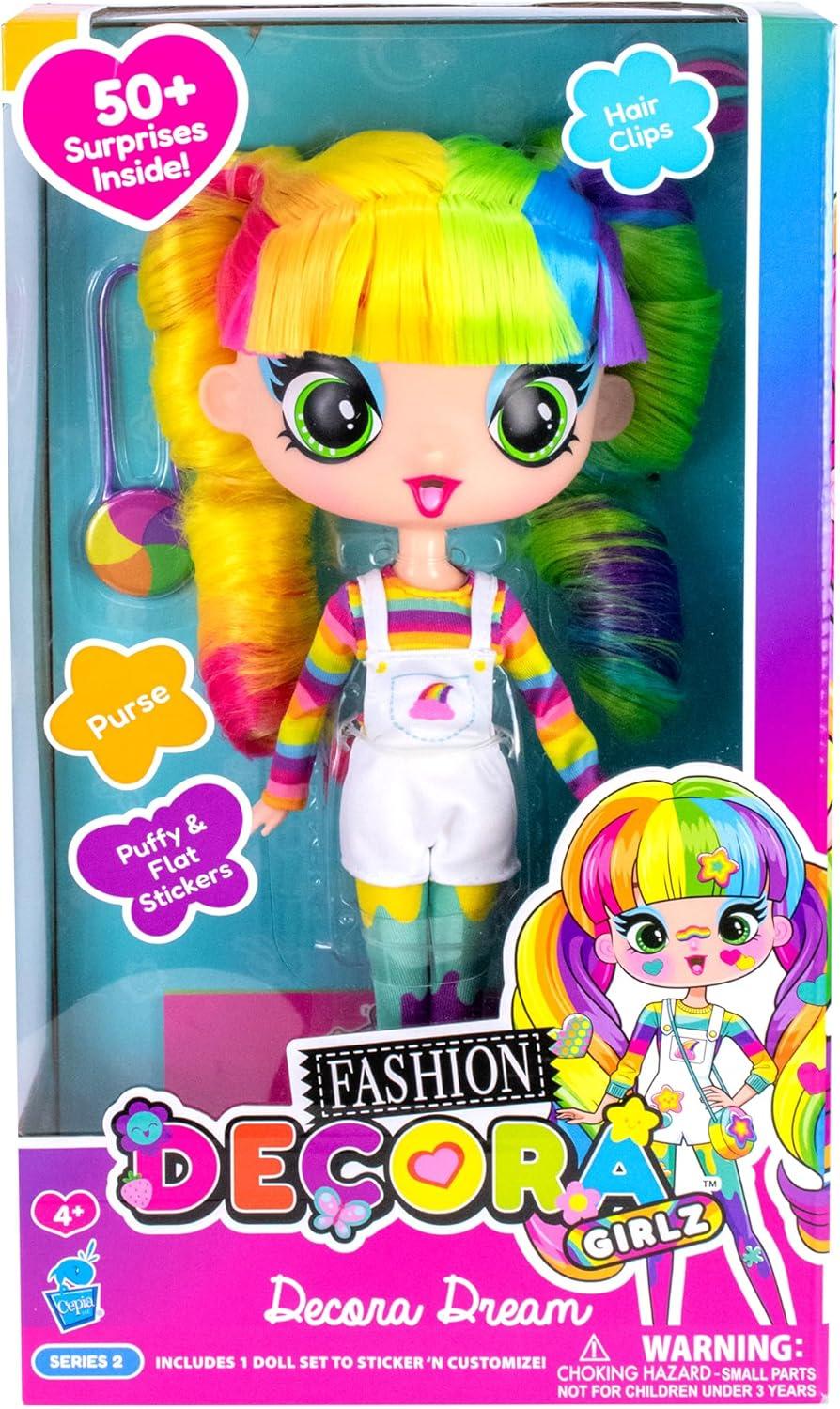 “Decora Dream is all about bold color, creative fashion, and endless styling fun. She rocks extra-long, fully rooted rainbow pigtails and a vibrant outfit featuring a striped rainbow top, white overall dress with rainbow and flower decals, splatter-print leggings, and chunky purple platform sneakers. Unbox 50+ surprises, including removable stickers, a rainbow-splashed crossbody bag, and Wear N Share barrettes to style both Decora Dream and you!”