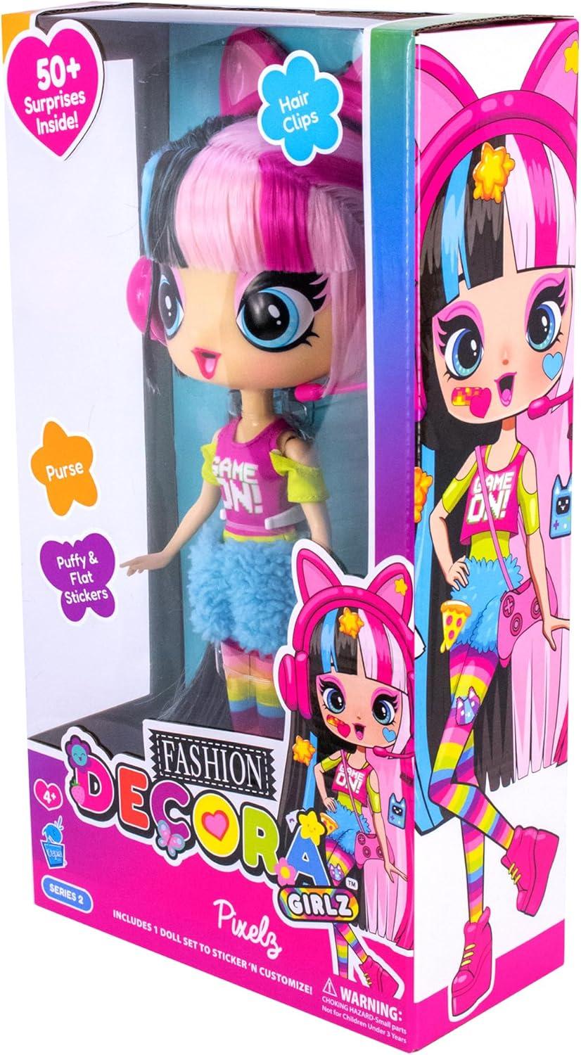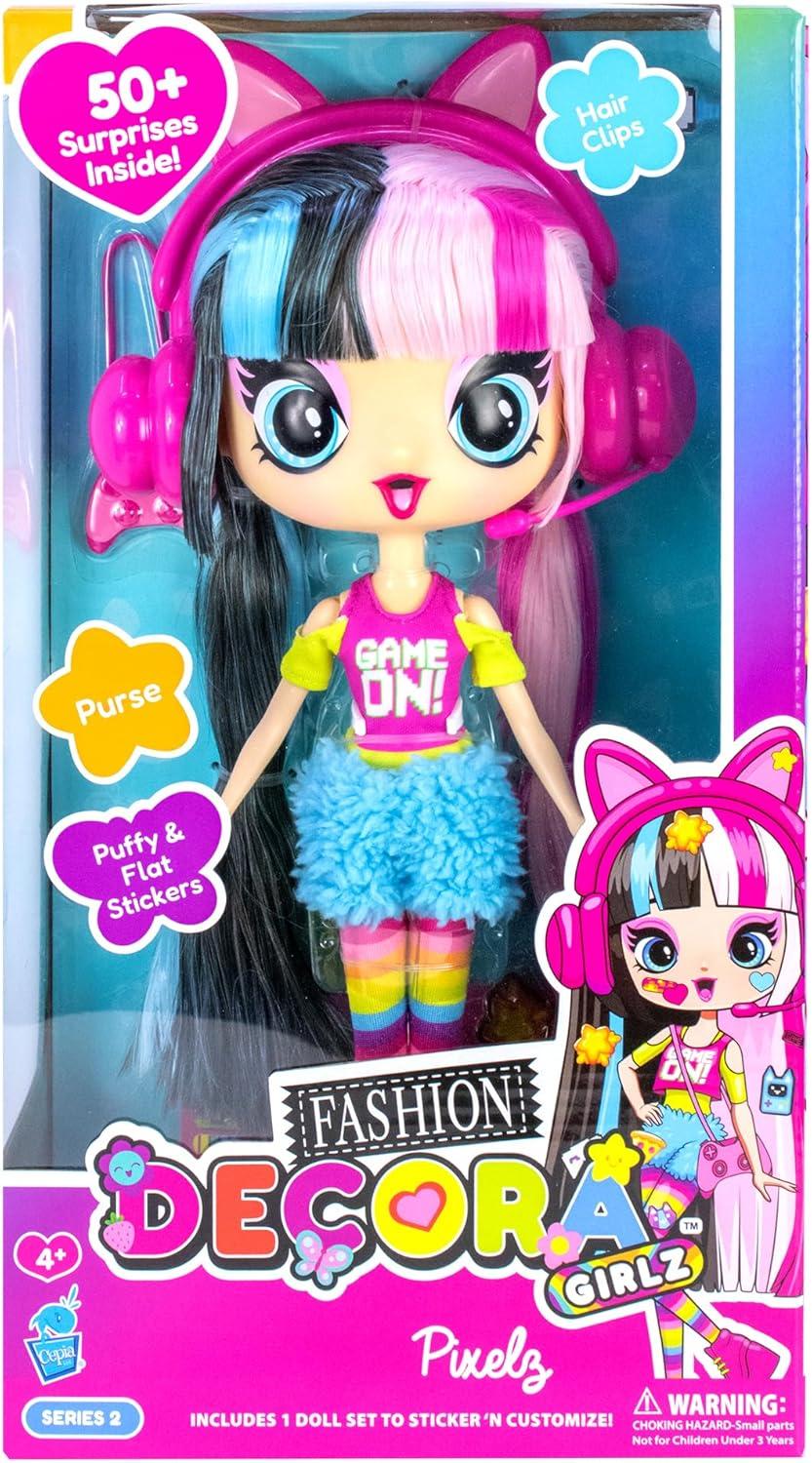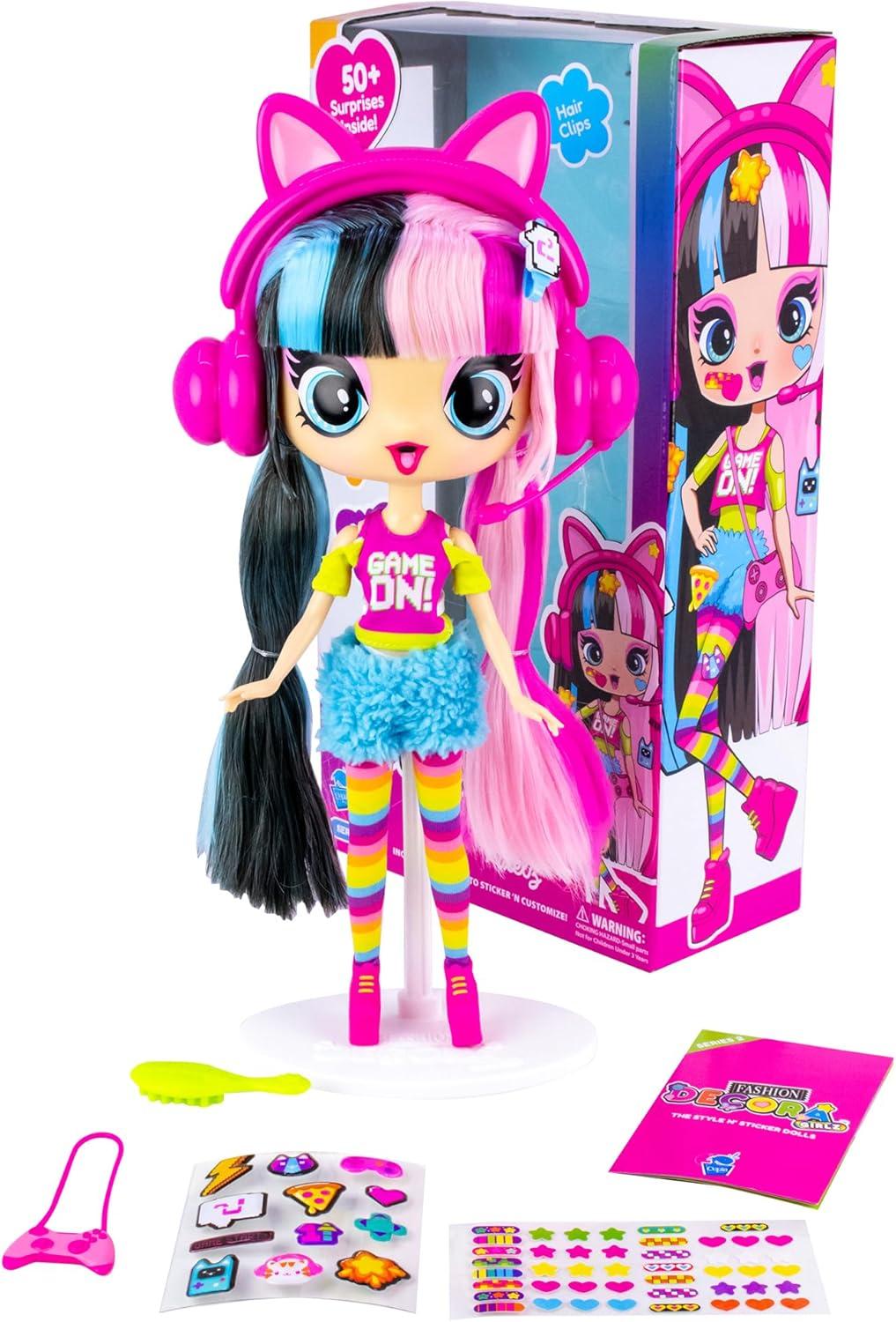 Decora Fashion Girlz Series 2– Pixelz the Gamer Girl – 11” Fabric-Costumed Posable Vinyl Doll with 50+ Surprises, Puffy & Flat Removable Stickers, Gamer Headset, and Accessories