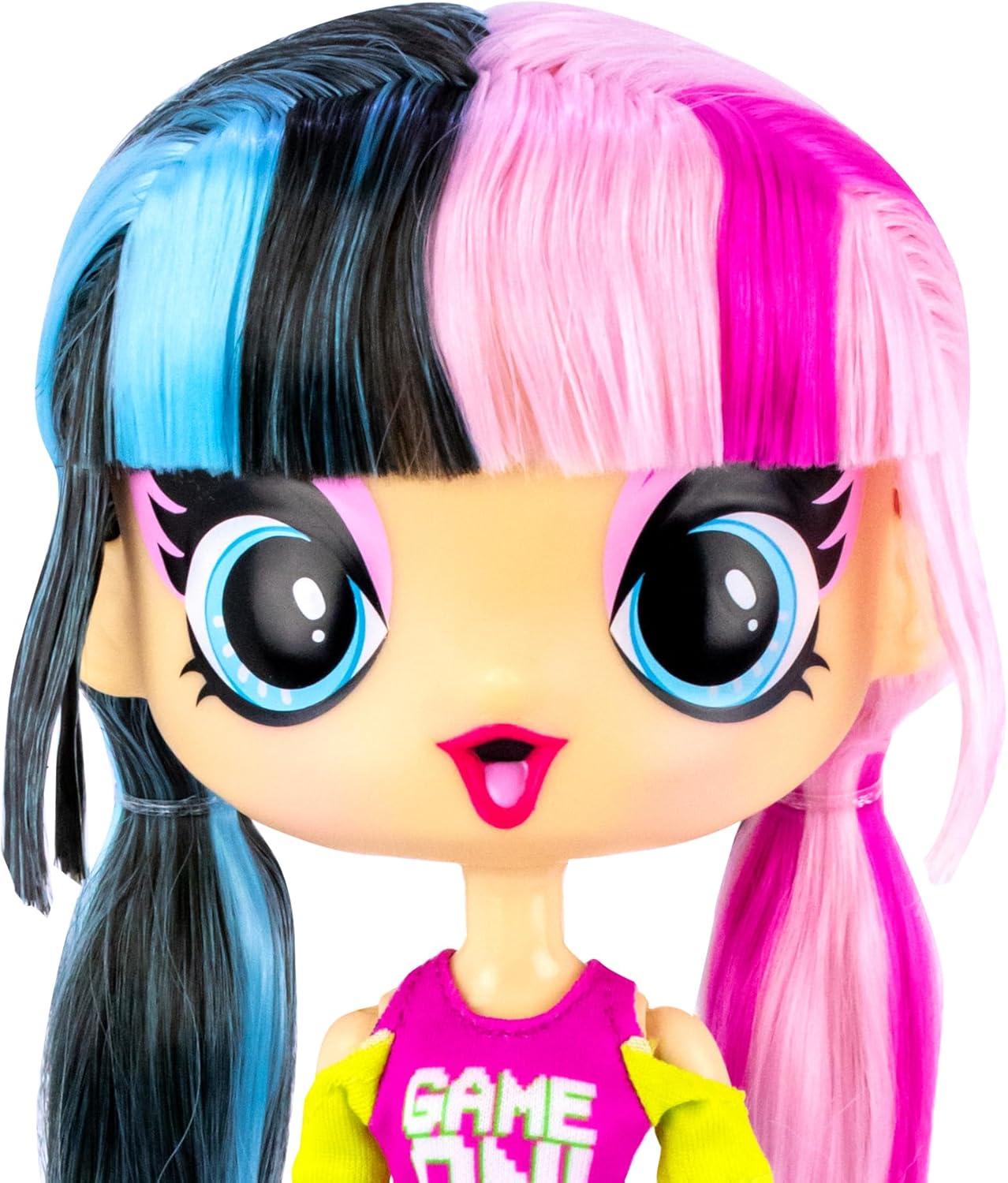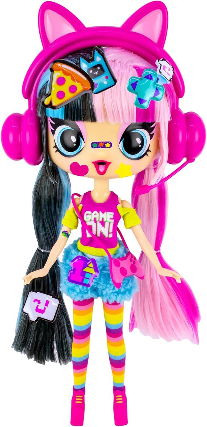 “Pixelz is the ultimate gamer girl, rocking split-dyed black and pink hair with blue streaks and a game-ready outfit featuring a cropped neon “Game On!” tee, fluffy pixel-blue skirt, rainbow-striped leggings, and chunky pink platform sneakers. Her gamer headset with cat ears makes her ready to stream, play, and win in style. Unbox 70+ surprises, including customizable stickers, a game controller crossbody bag, and Wear N Share barrettes to style both Pixelz and you!”